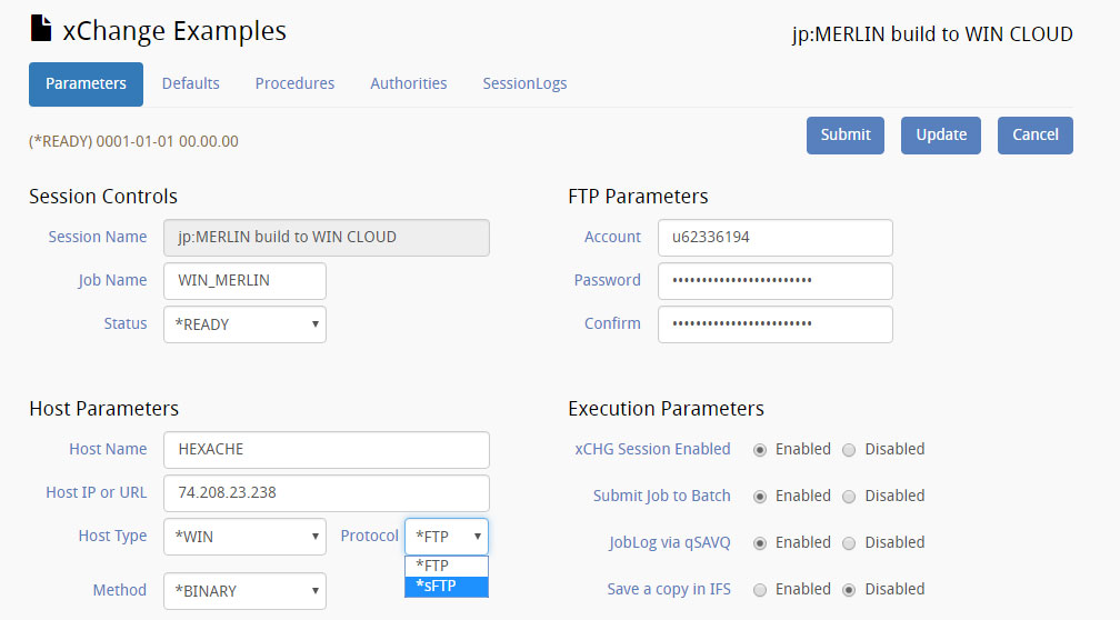 xCHANGE sFTP(SSH) v6.04.19Full support of Unix based sFTP using Secure Shell (SSH).Select PROTOCOL [*sFTP] on xCHANGE session setup.