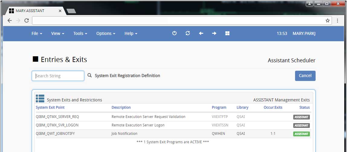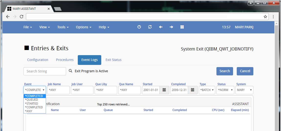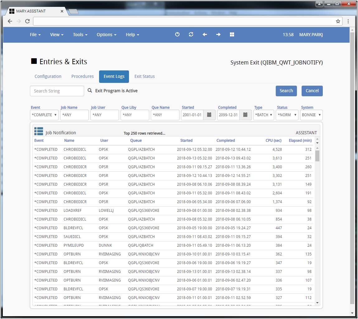 Job Notification Exit (Event Logs) v8.09.13on Job Notification(QIBM_QWT_JOBNOTIFY) system exit, turn on the Event Log to view all jobs in queue, started and completed...The data is kept in zJOBS.pf